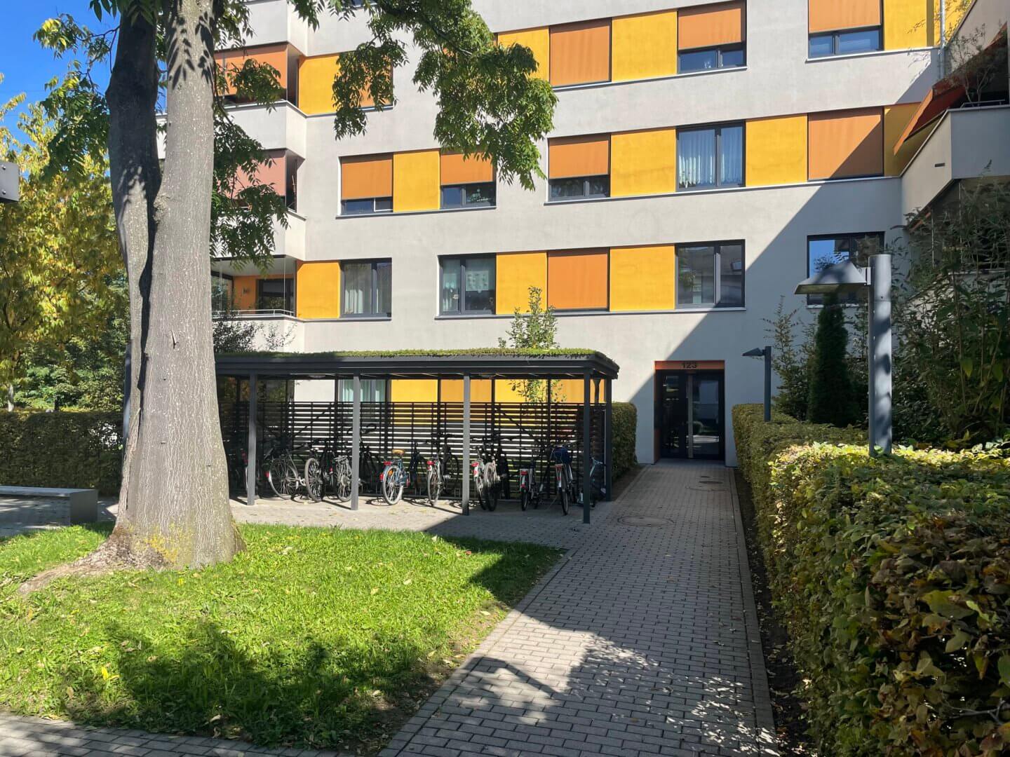 Vor dem Haus befindet sich ein kleiner Spielplatz und viele überdachte Fahrradstellplätze.