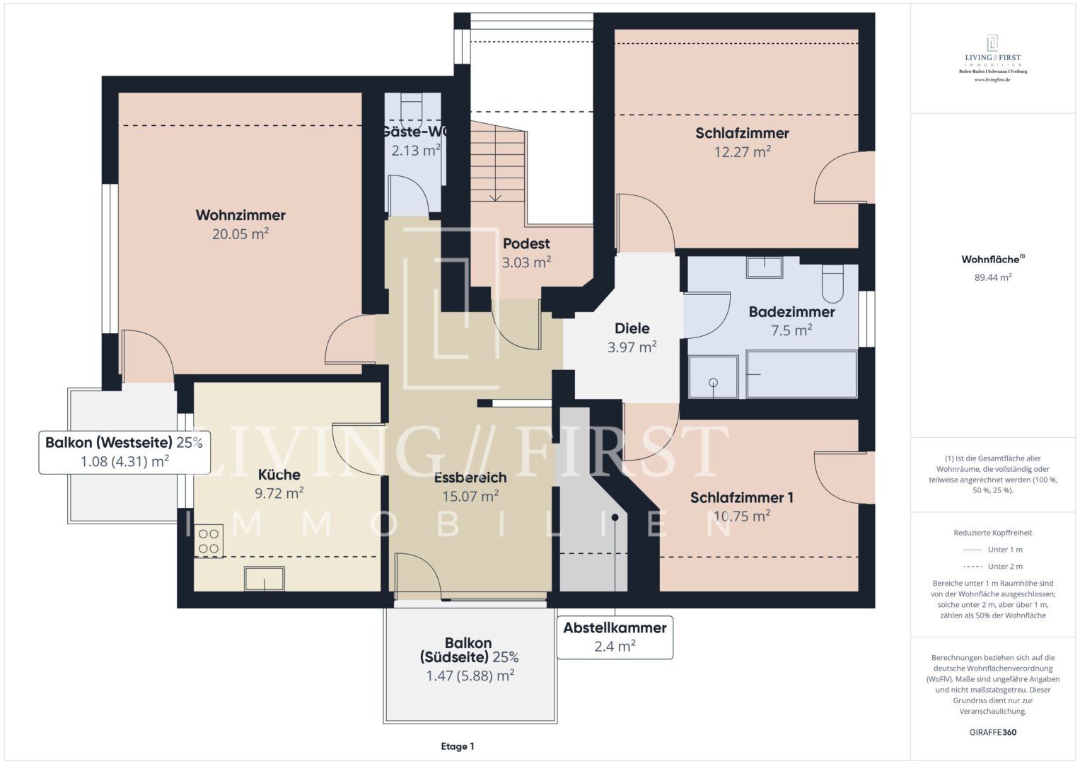 Die Wohnung im Obergeschoss ist mit zwei großen Balkonen (südliche und westliche Ausrichtung) ausgestattet.